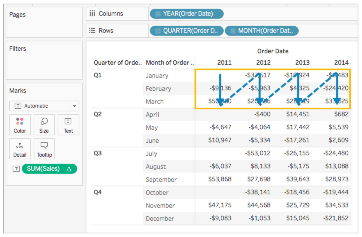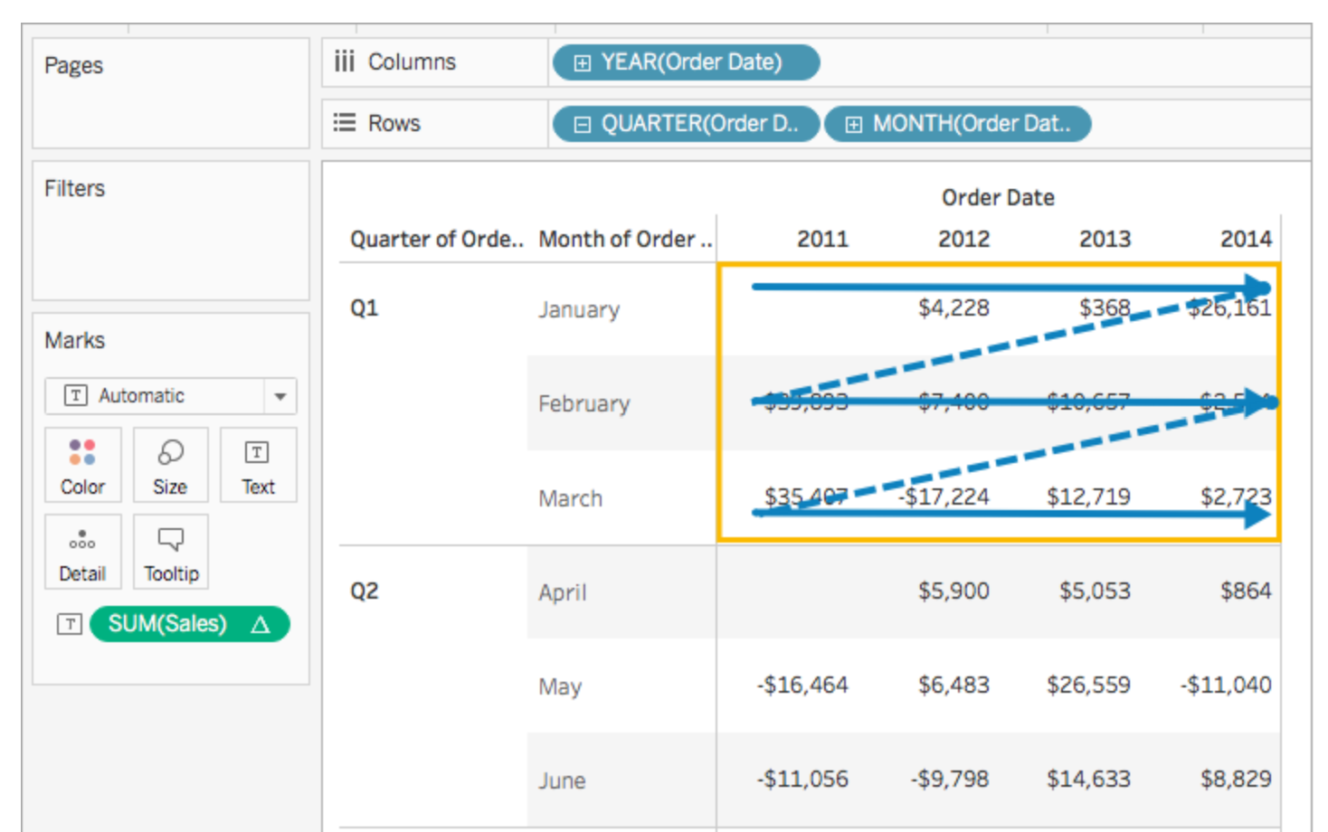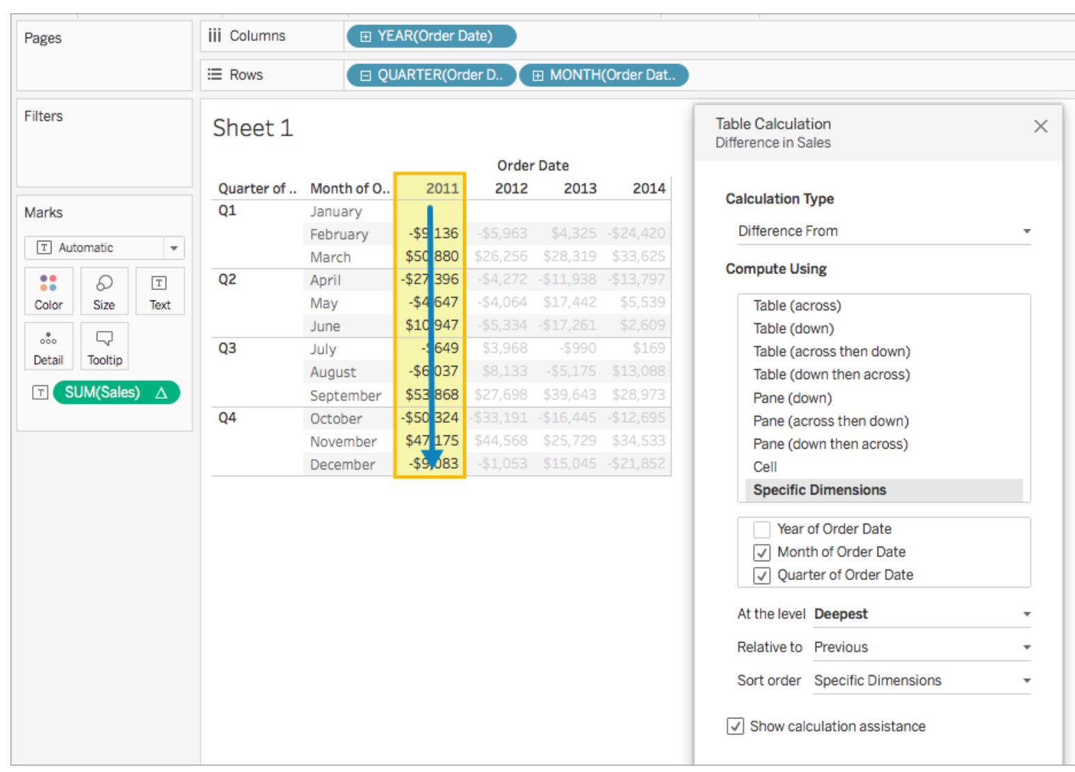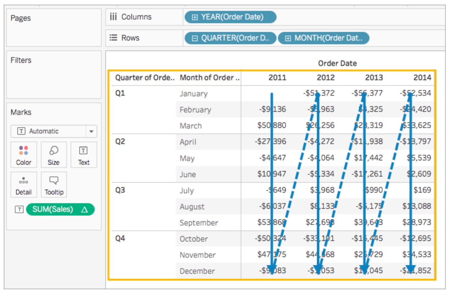 예를 들어 다음 비주얼리제이션에서 Month of Order Date 및 Quarter of Order Date 차원은 선택되어 있기 때문에 주소 지정 필드이고 Year of Order Date 차원은 선택되어 있지 않기 때문에 파티션 지정 필드이다. 따라서 계산은 연도별로 모든 분기에 대한 각 월의 차이를 변환한다. 계산은 매년 다시 시작된다