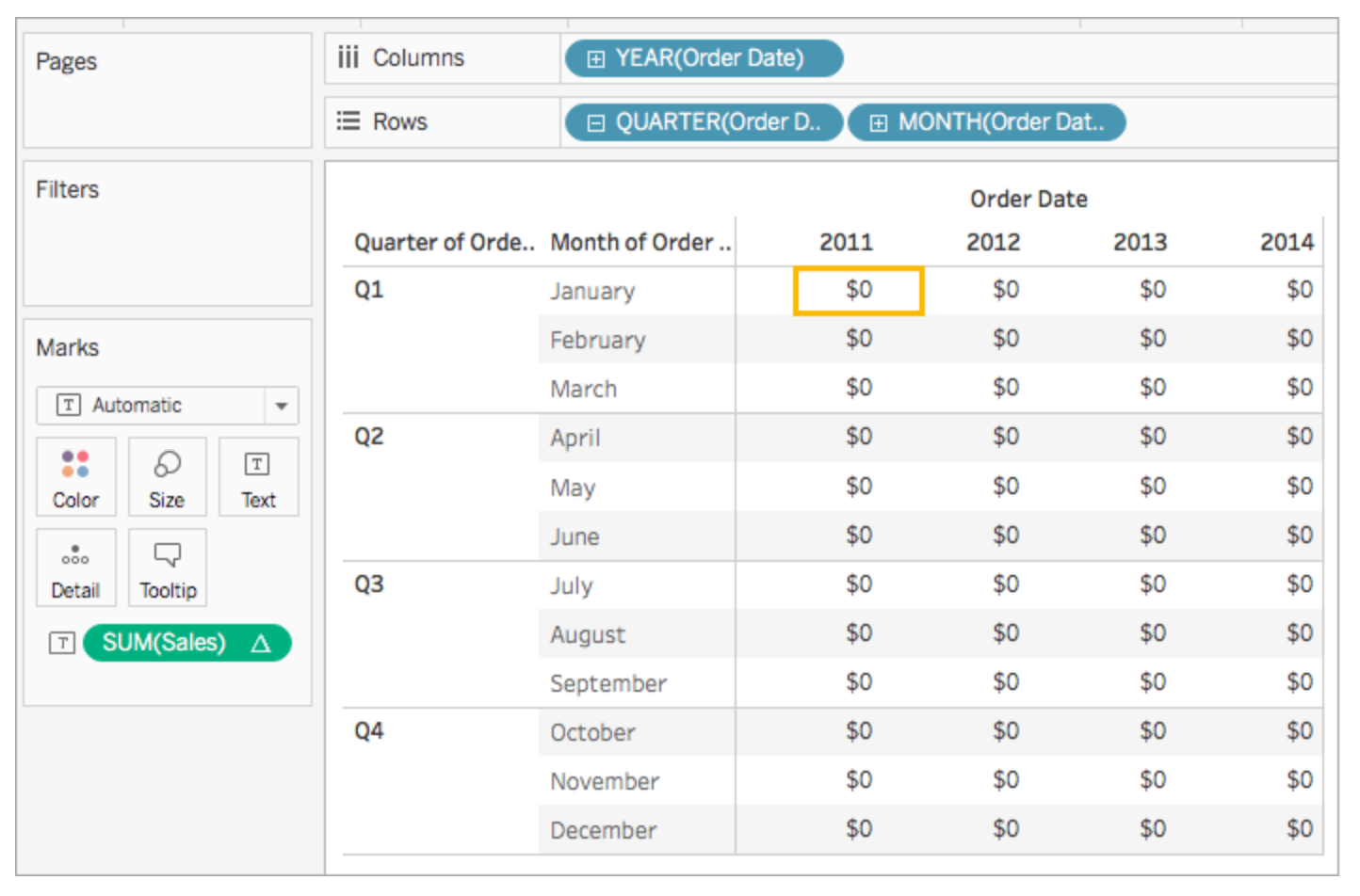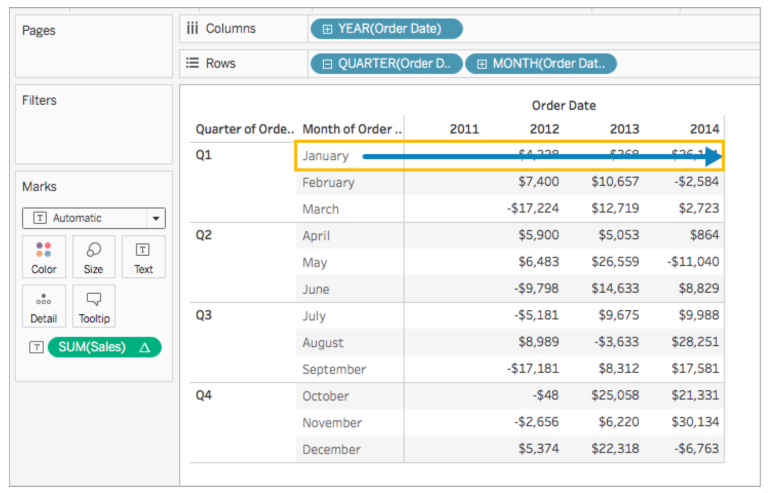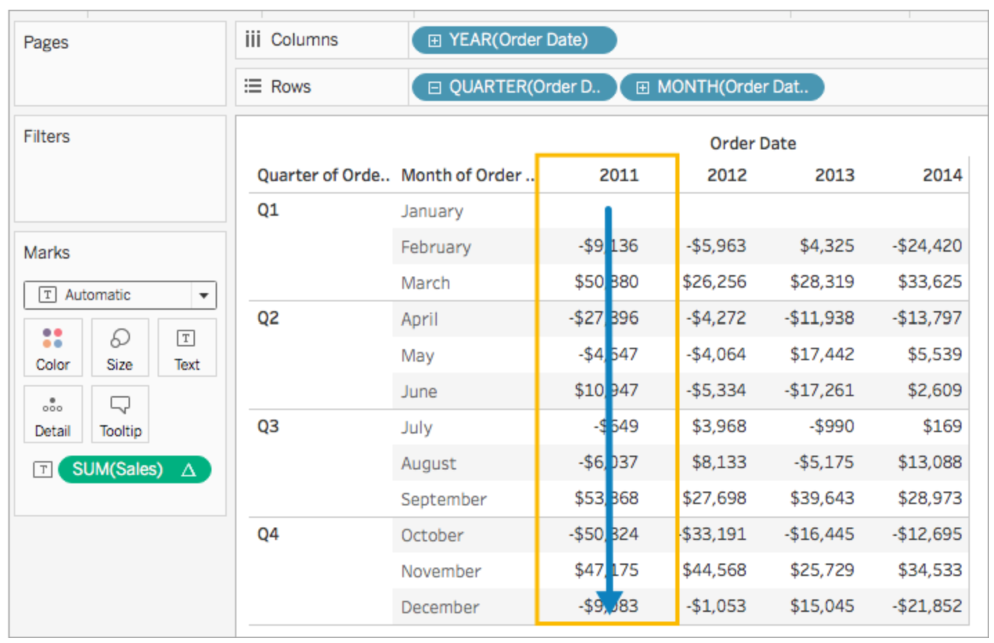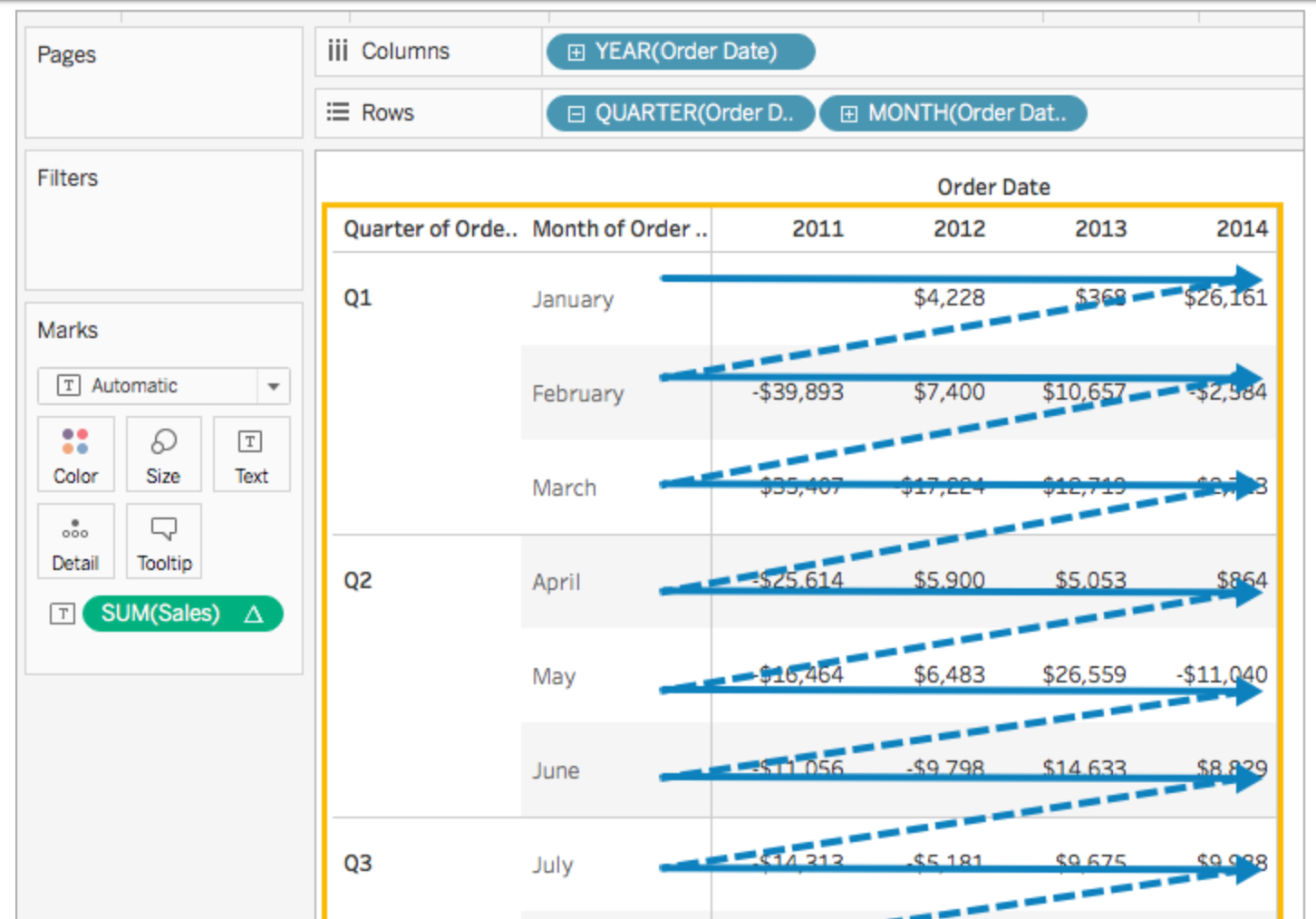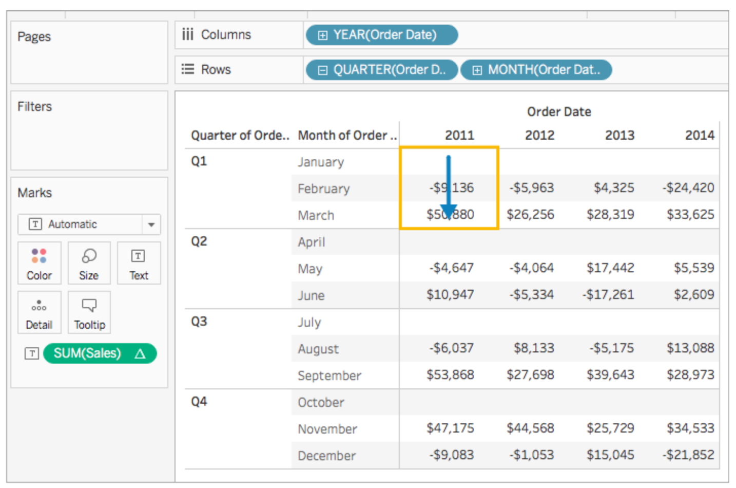 예를 들어 다음 비주얼리제이션에서 Month of Order Date 및 Quarter of Order Date 차원은 선택되어 있기 때문에 주소 지정 필드이고 Year of Order Date 차원은 선택되어 있지 않기 때문에 파티션 지정 필드이다. 따라서 계산은 연도별로 모든 분기에 대한 각 월의 차이를 변환한다. 계산은 매년 다시 시작된다