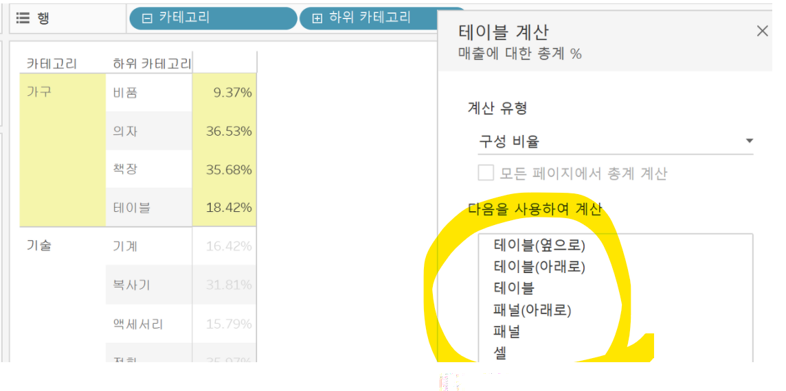 9) 특정차원 reference:https://help.tableau.com/current/pro/desktop/ko-kr/calculations_tablecalculations.htm : 지정한 차원 내에서만 계산